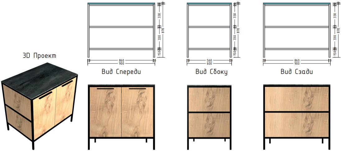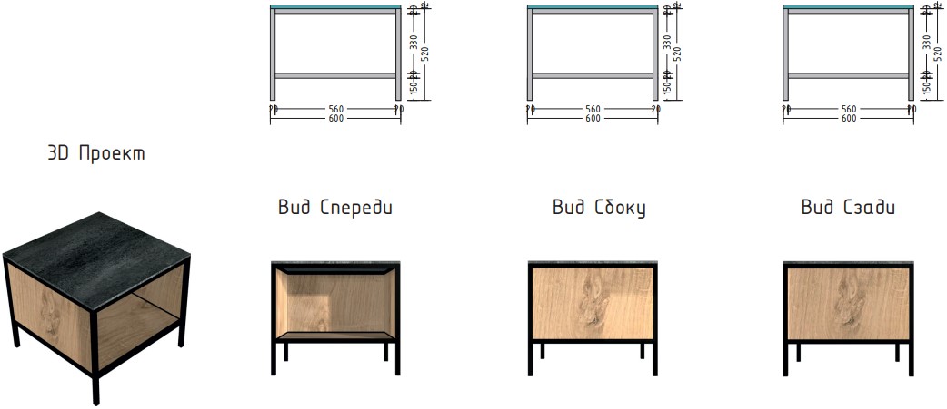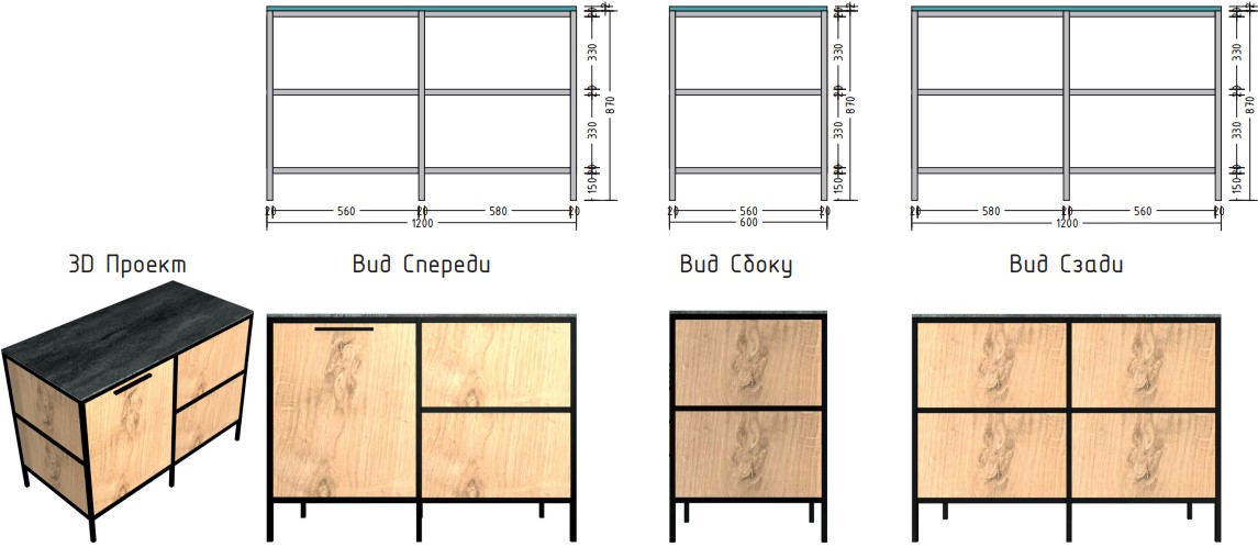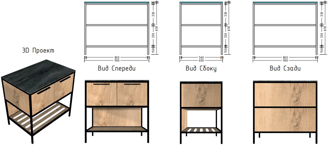 Материал столешницы Шунгит повторяет текстуру камня, древесный Ирландский дуб используется для каркаса и фасадов. В дальнейшем палитра цветов и ассортимент модулей будут расширяться.
