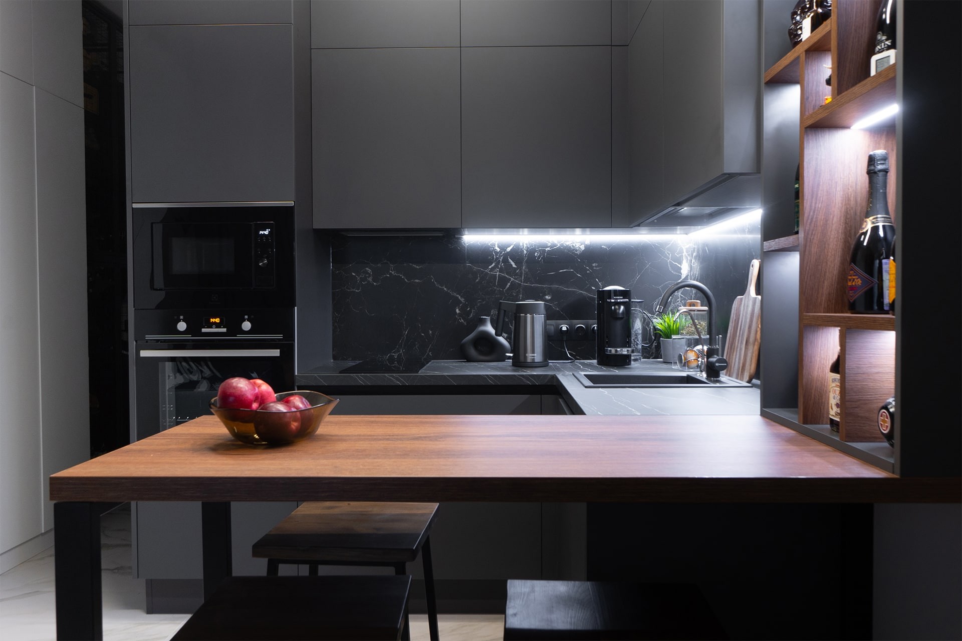 - Они помогают зонировать пространство. Черный цвет позволяет выделить зону приготовления пищи в кухне-гостиной или студии, а столешница под древесину может стать своего рода связующим элементом с другими деталями интерьера в зоне отдыха.