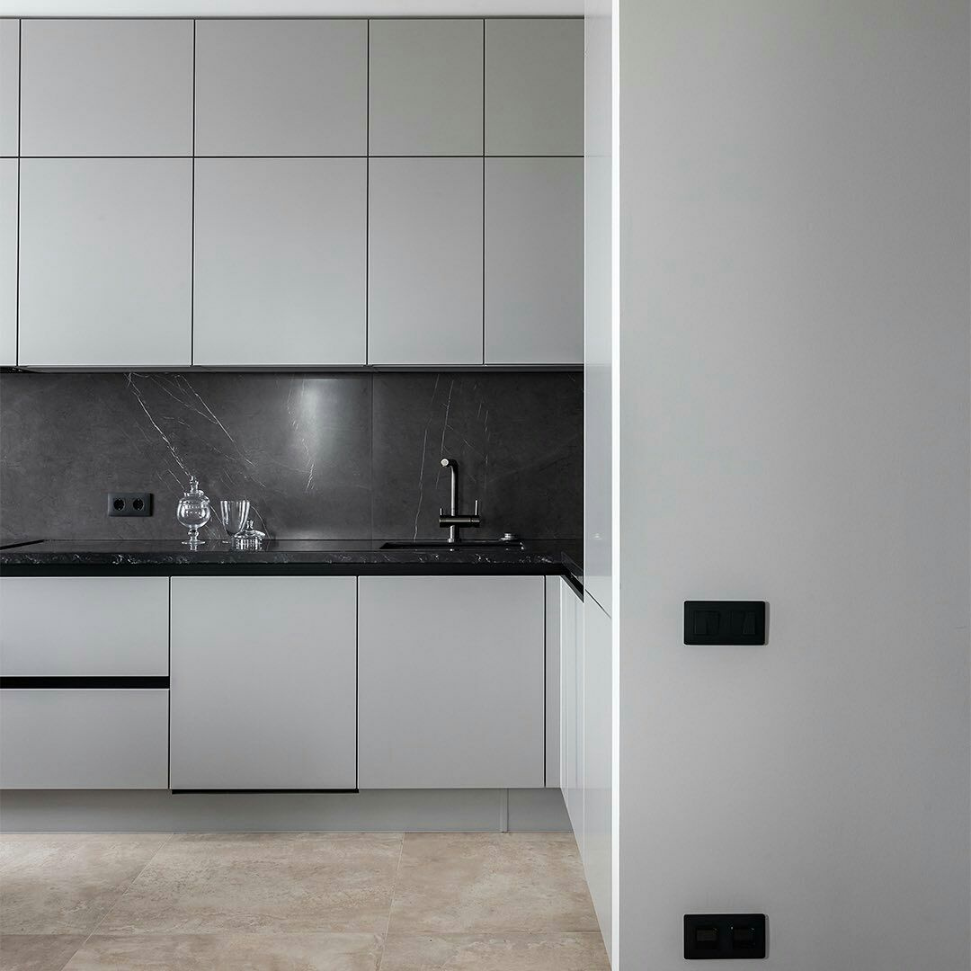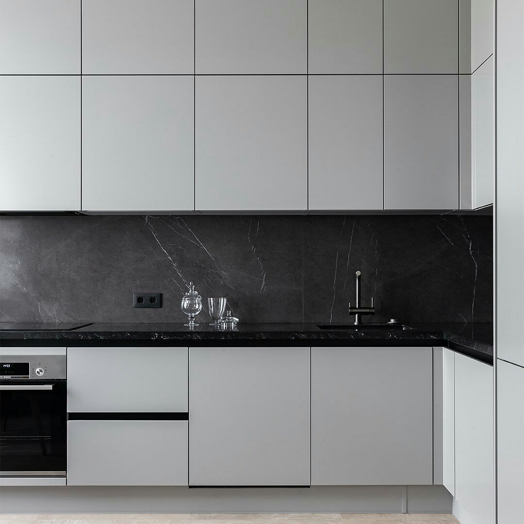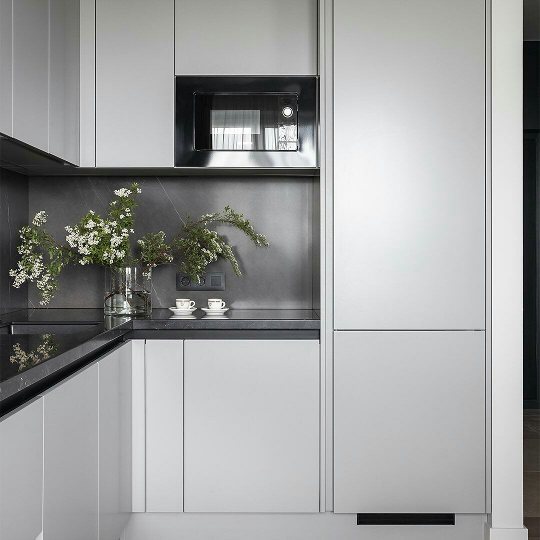 Угловая серая кухня: минимализм и скрытое хранение