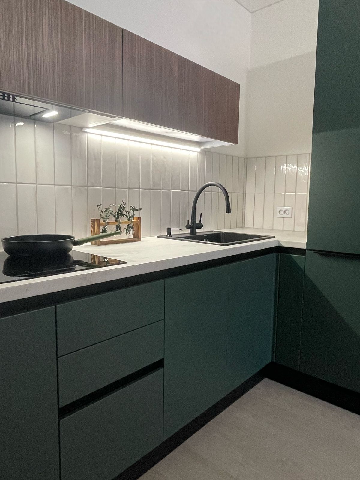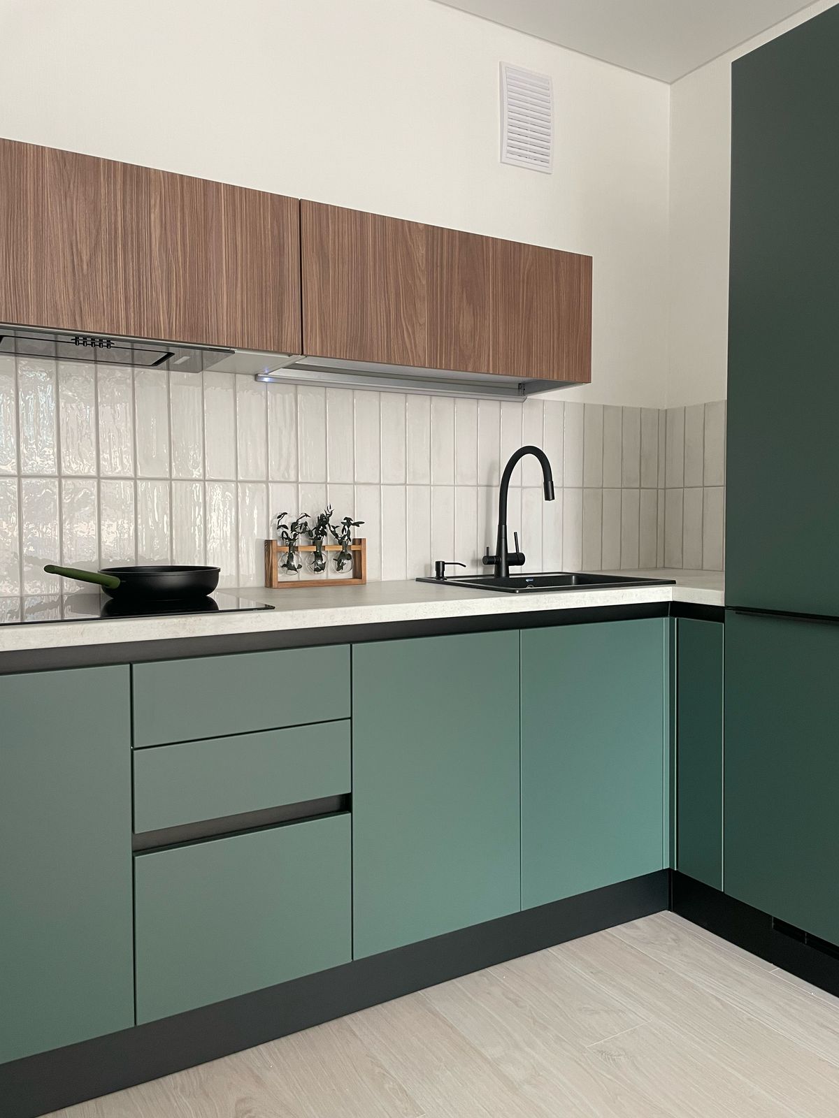 О проектеОписаниеУютная кухня в природных оттенках для молодой пары. Екатерина и Максим сразу знали, как должна выглядеть их кухня по комплектации и цветам. По словам заказчиков "Вживую кухня выгладит классно!"